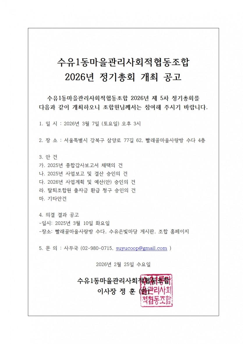 [ 수유1동마을관리사회적협동조합 2026년 정기총회 개최 공고 ]